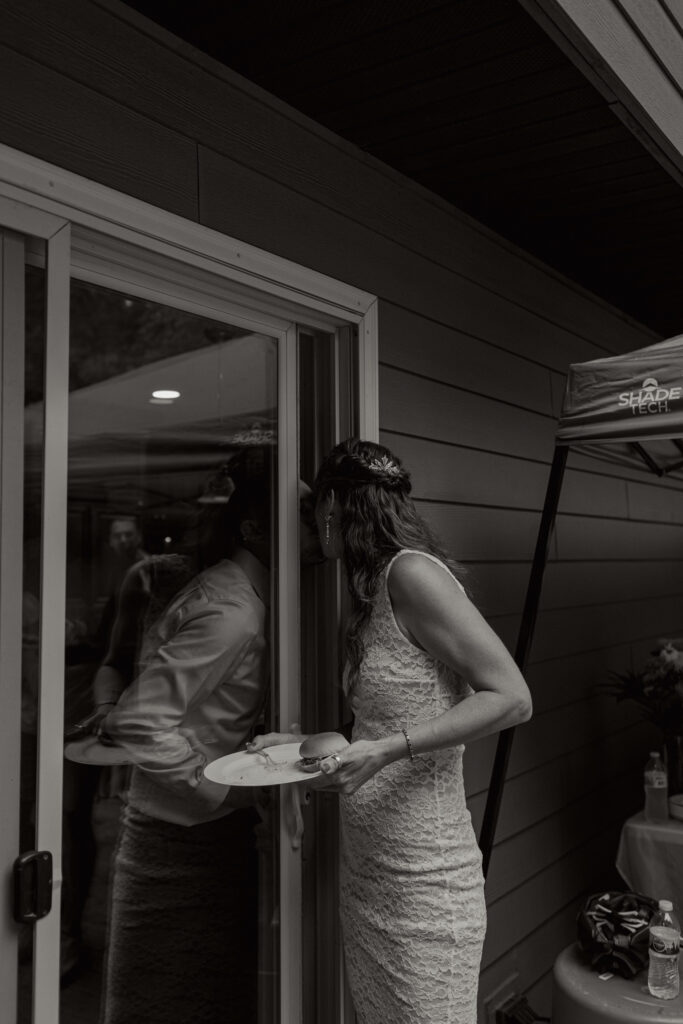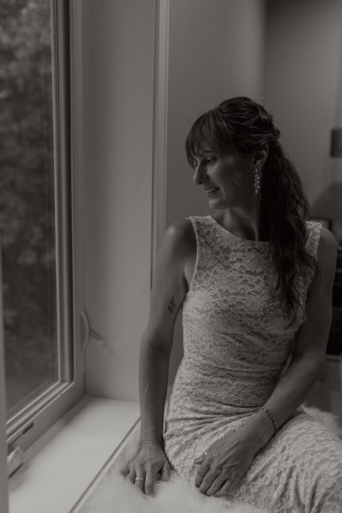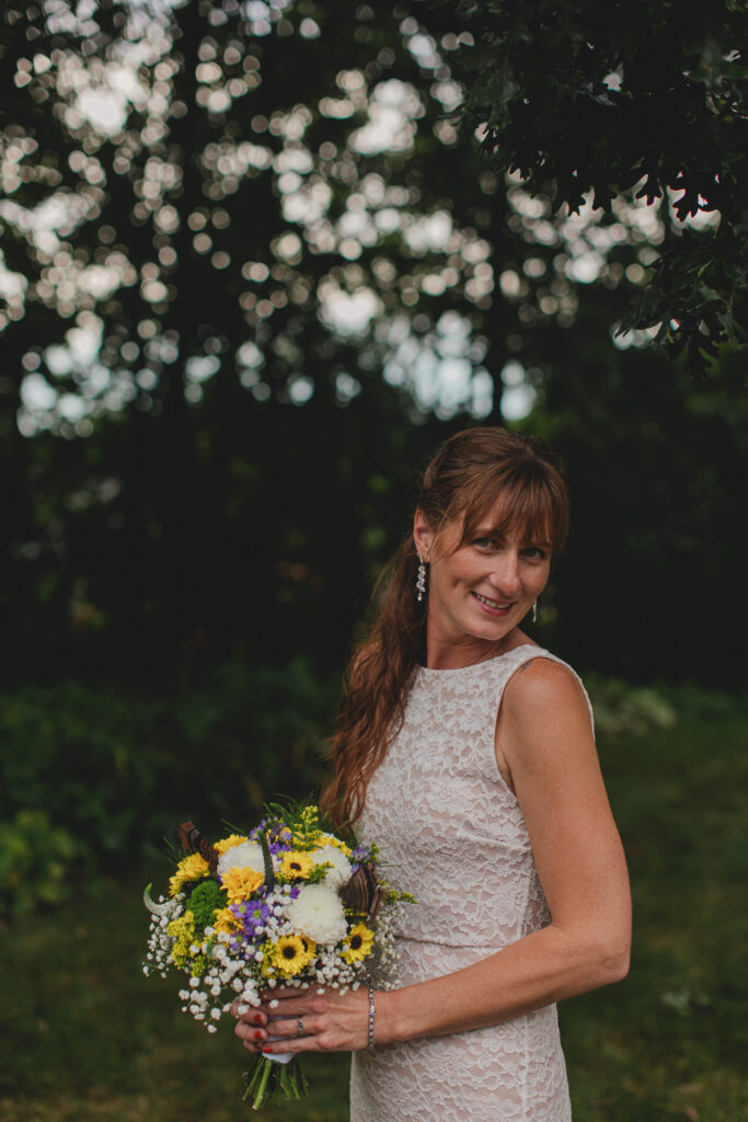 This wedding was truly a family affair. The bride & groom’s friends and family decorated the backyard, and a friend doubled as the makeup artist. Catie’s lace dress looked like it was made perfect just for her, but was a thrifty find! She spent the morning helping her daughters get ready, steaming dresses and making sure every detail was perfect.