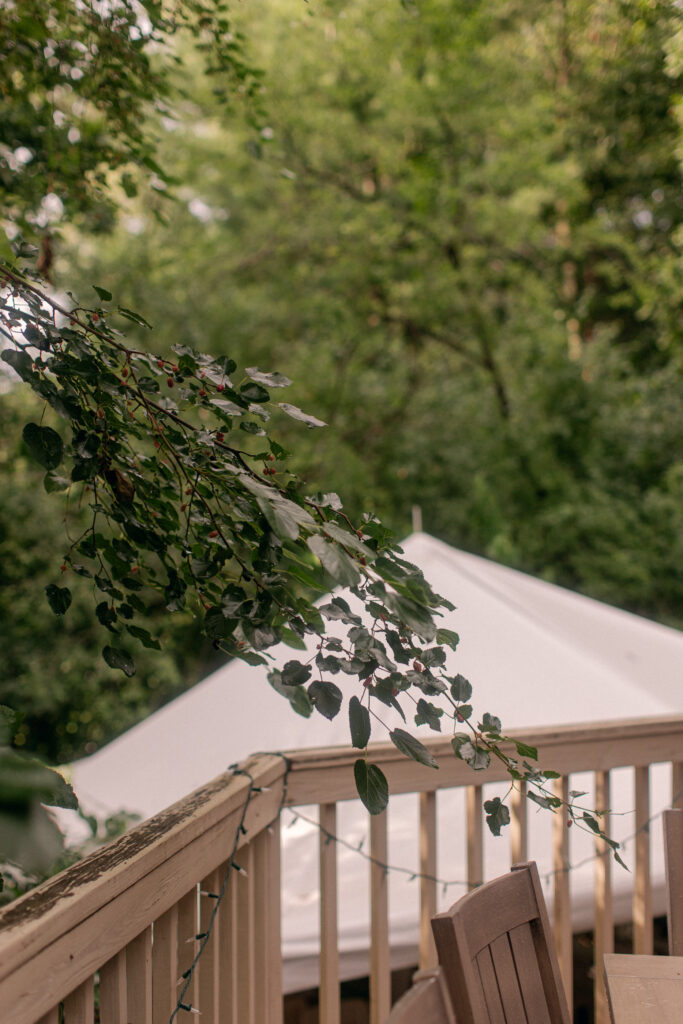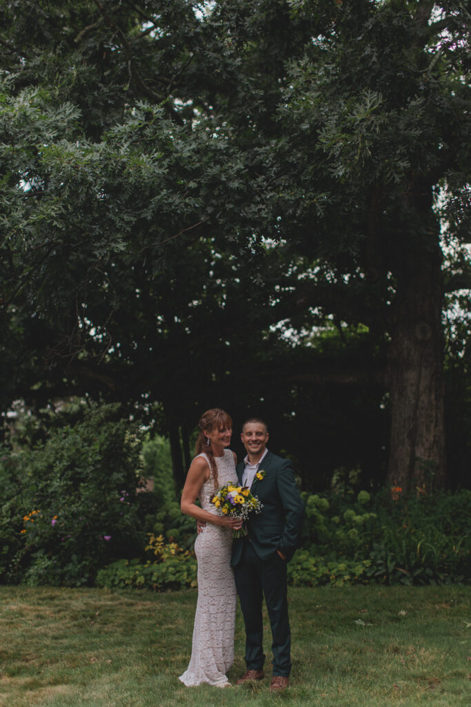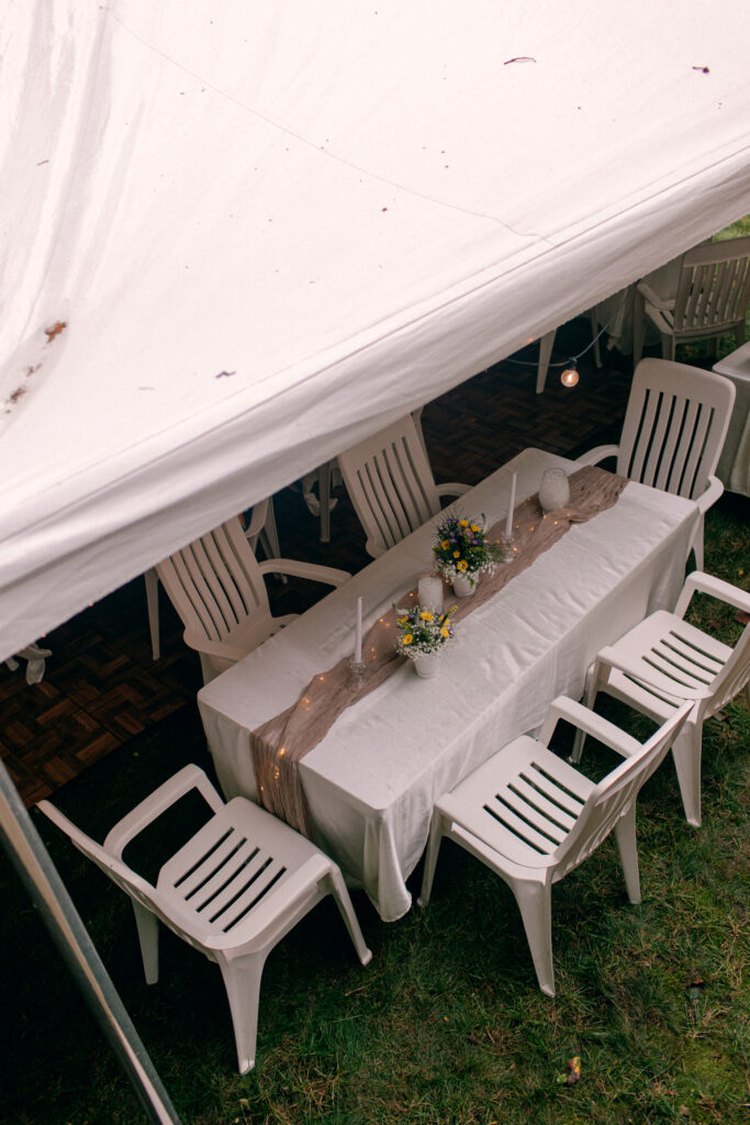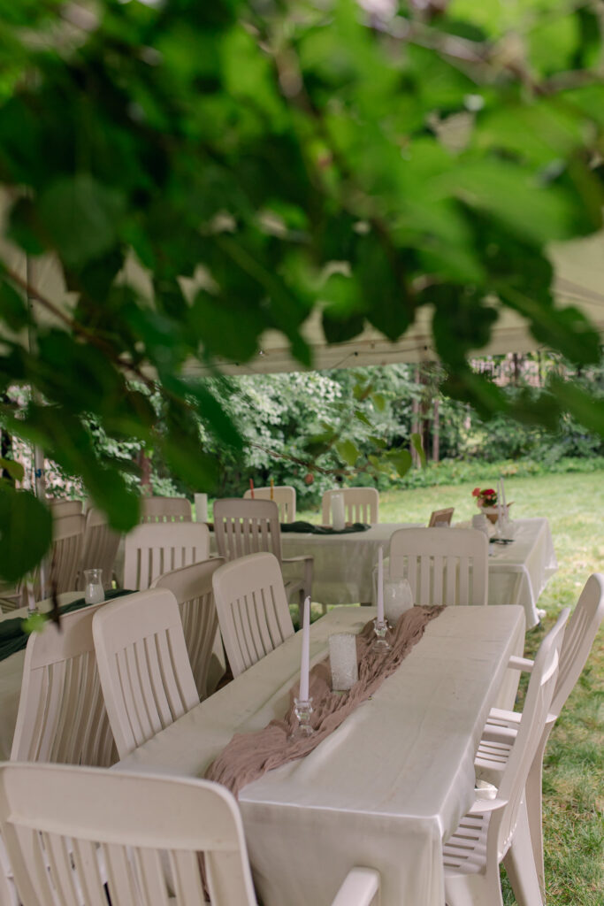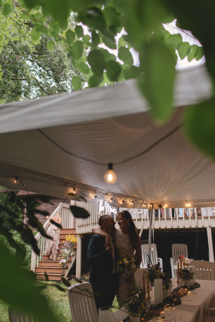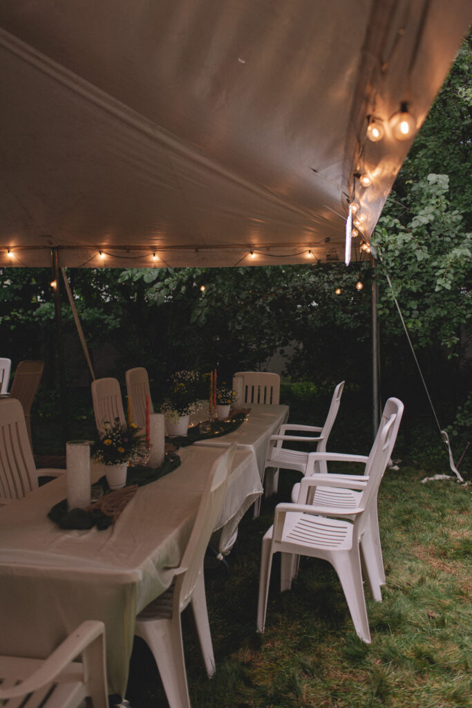 Erik’s parents’ backyard was transformed into a wedding venue overnight. A big oak tree greeted guests at the front, while lush gardens framed the reception space. Rain in the morning meant a tent went up just in time, strung with lights and filled with tables, candles, vases, and soft green table runners. The whole scene gave off cozy, garden-party vibes—part fairytale, part DIY magic.