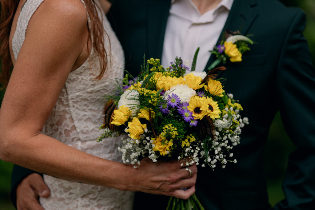 Erik and his dad spent the night before the wedding prepping the wild game they had hunted themselves into beautifully grilled kebabs. The frozen pistachio cake—made by Erik’s mom—was one of his favorite desserts. It wasn’t just food, it was family history served on a plate. Even the flowers carried meaning. Catie’s bouquet and Erik’s boutonniere included feathers from one of his turkey hunts. Every little detail reflected their story and their hearts.